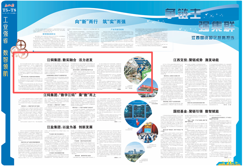 近日,《江西日报》推出“工业强省 数智领航”专题,展示江西工业高质量发展的生动实践和江西工业在数字浪潮中的发展路径,在“争链主 强集群 江西国资国企挺膺担当”专版中,详细介绍了江铜数智化建设工作亮点。
